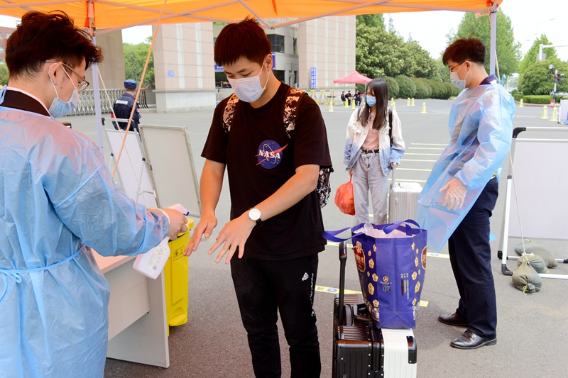 拖着消过毒的行李箱,不少同学直接来到学校提供的转运车前。辅导员老师不时向学生提醒:“这里有电瓶观光车,可以直接把你们送过去。”在校园里闲庭信步,不时可见“春风十里不如学校有你”“欢迎回家”等标语,户外售餐点、餐厅广场一侧的洗手池、图书馆前清晰的一米线……处处表明学校为迎接学生返校、开学复课做好了各项工作。