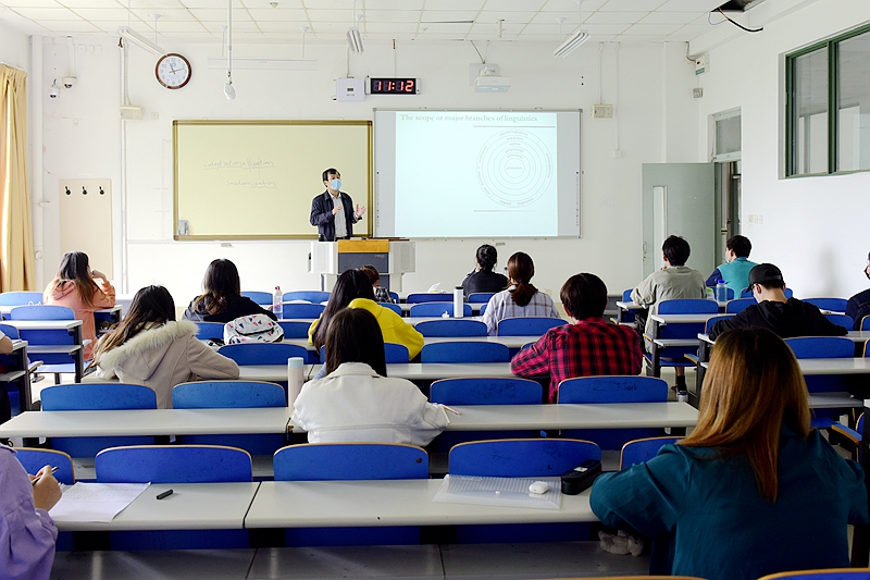 走近课堂,不时听见教师和同学们交流的笑声。孙畅在彭建武教授的课上认真听讲,“因为疫情,时隔5个月我们重新回到美丽校园,看到老师熟悉的面孔,心里激动之情难以言表。今天上午彭建武老师为我们精心准备了英语语言学课程,他在讲台生动的讲解,使我们快速进入学习状态,学习效率提高不止一倍,没有返校的同学也可通过学校提供的直播设备观看讲课。”孙畅说出了不少同学的心声。
