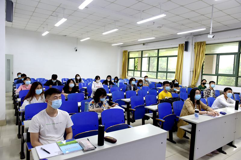 同学们在阶梯教室严格按照要求戴口罩、间隔就座