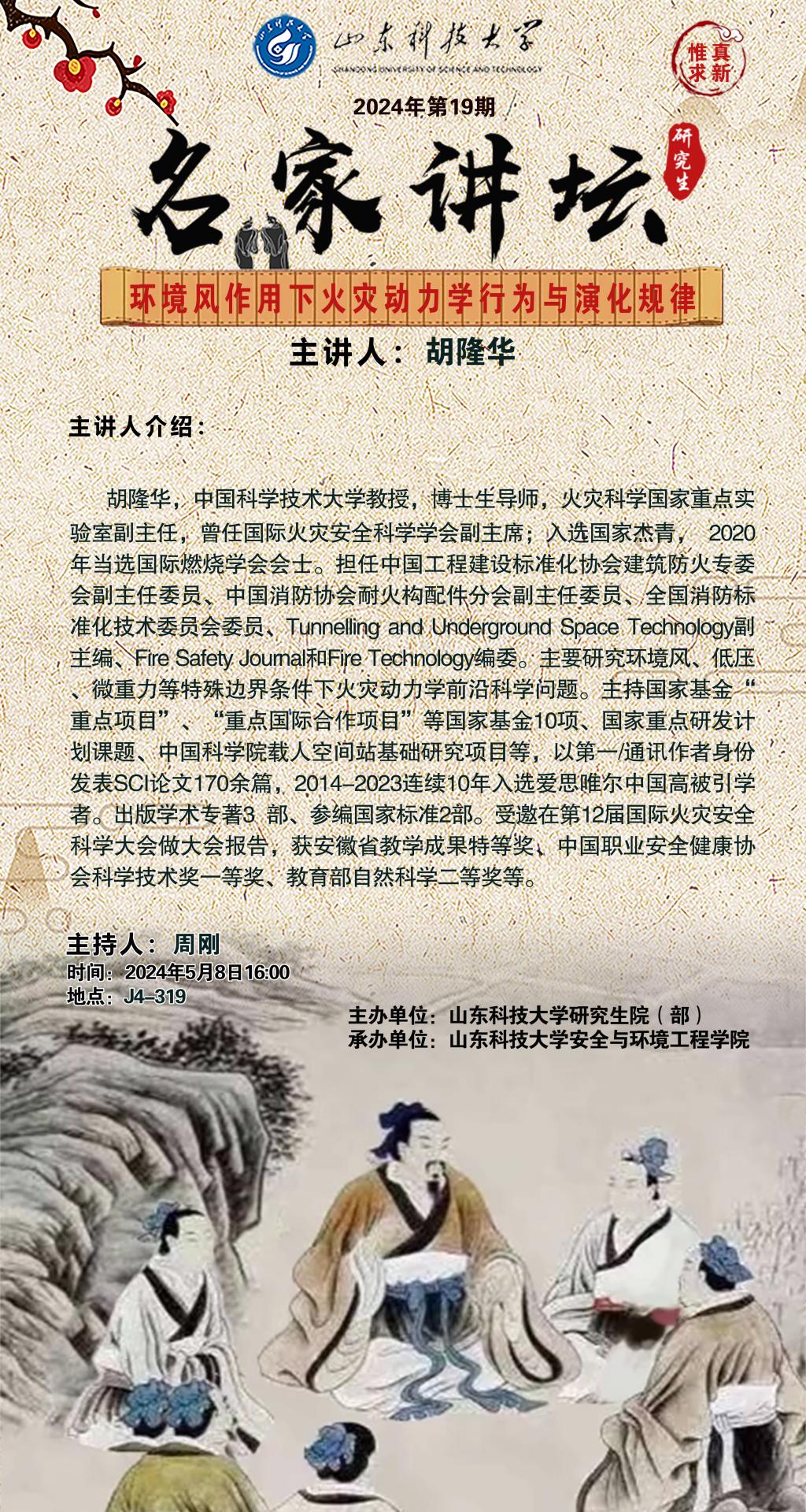 “名家讲坛”2024年第19期:环境风作用下火灾动力学行为与演化规律(总913期)
