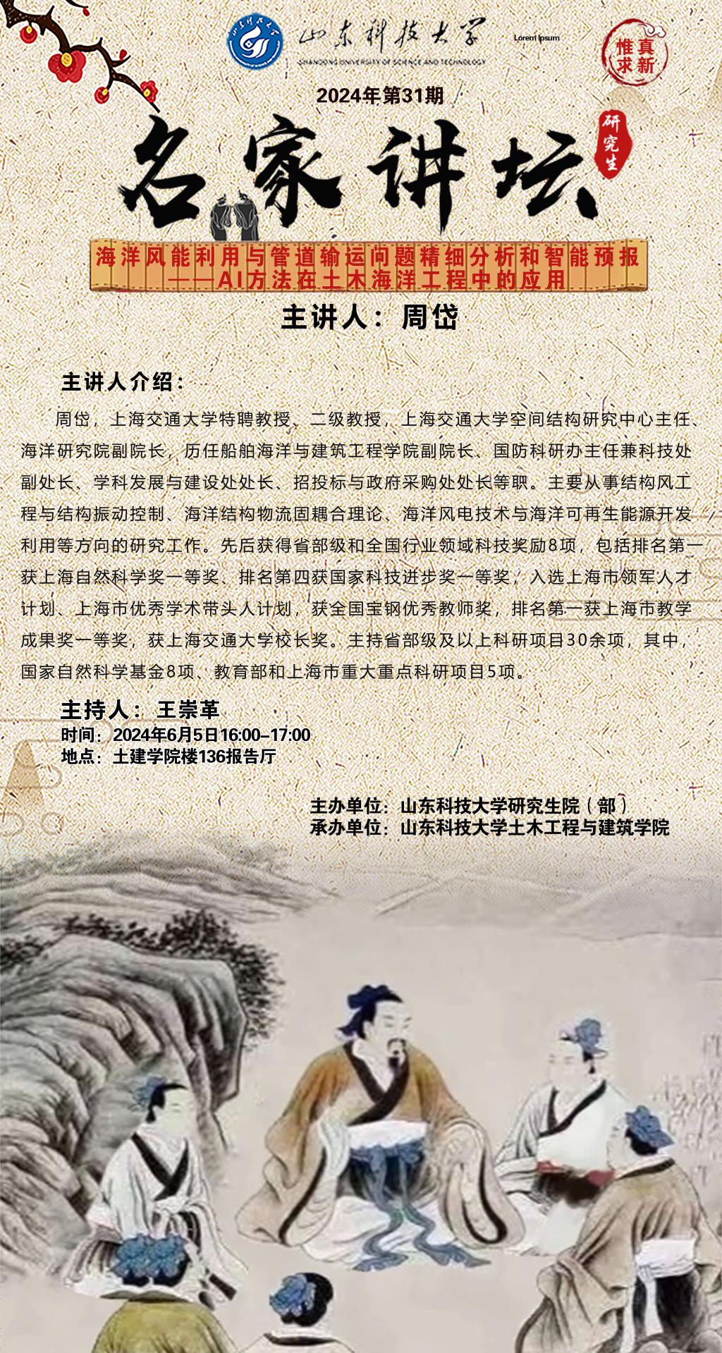“名家讲坛”2024年第31期:海洋风能利用与管道输送问题精细分析与智能预报——AI方法在土木海洋工程中的应用(总925期)
